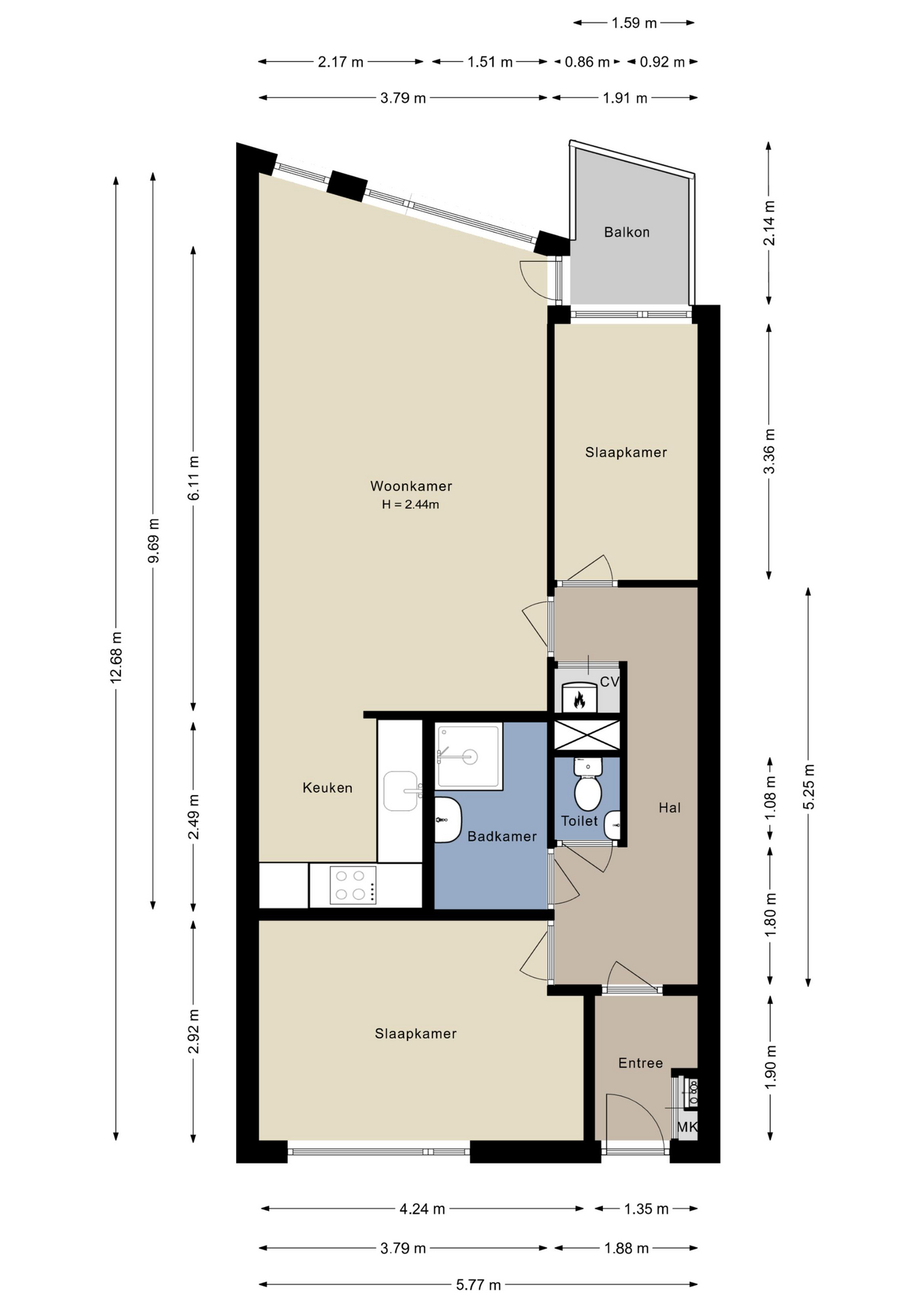 Entree met tochtportaal en garderobe. Vanuit de ruime hal heb je toegang tot alle vertrekken. Aan de voorzijde ligt de heerlijk lichte woonkamer met directe toegang tot het balkon op het zuiden. De moderne, open keuken in hoekopstelling beschikt over diverse inbouwapparatuur zoals een inductiekookplaat, afzuigkap, koelkast, vriezer, oven en vaatwasser. De hoofdslaapkamer bevindt zich aan de rustige achterzijde van het complex. Aan de voorzijde is een tweede slaapkamer gesitueerd. De badkamer is netjes afgewerkt en voorzien van douche, wastafelmeubel en aansluiting voor de wasmachine.