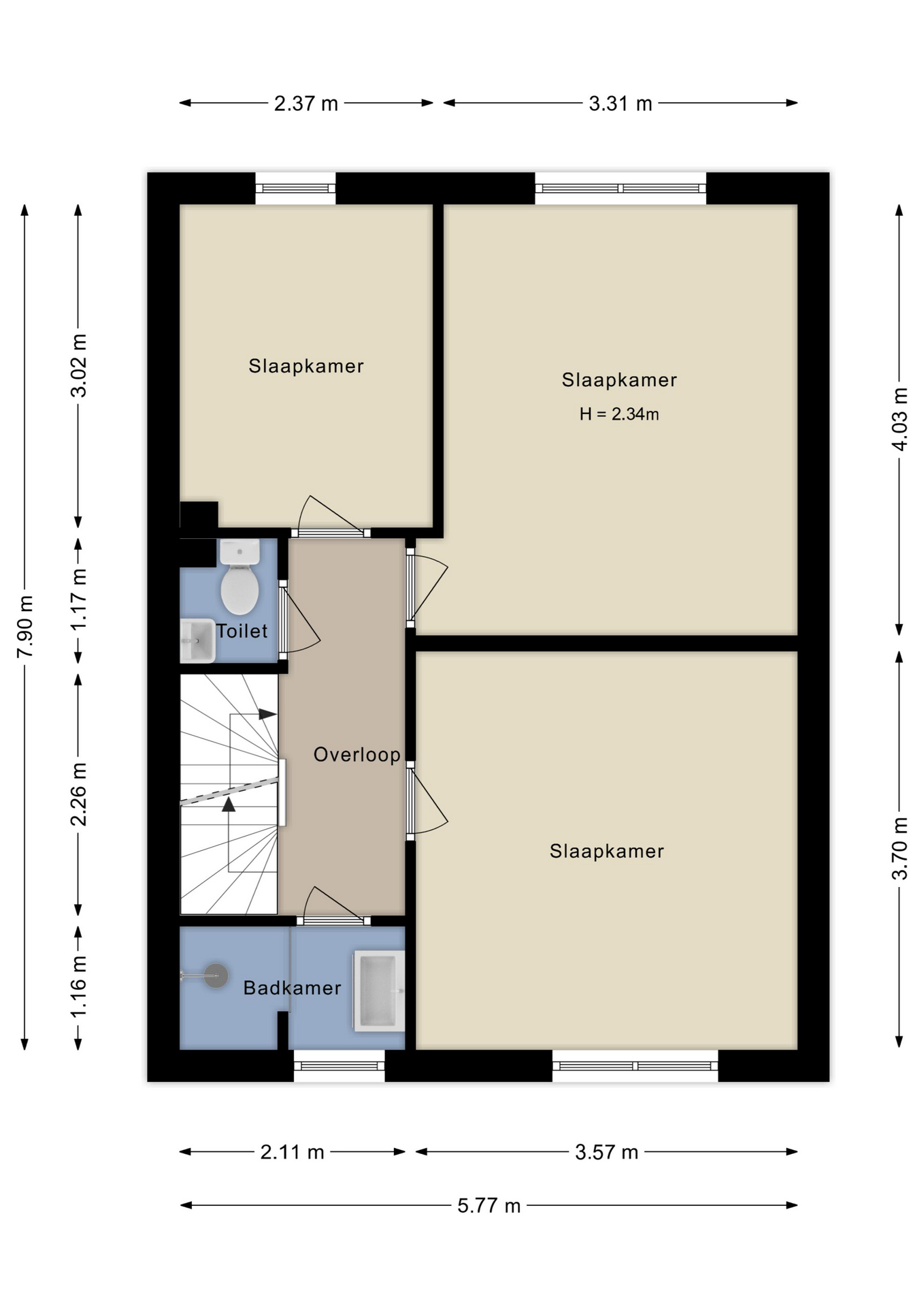 Op de eerste verdieping bevinden zich een separaat toilet, drie slaapkamers en een nette badkamer met douche en wastafelmeubel. De slaapkamers zijn goed van formaat, keurig afgewerkt en voorzien van grote raampartijen.