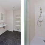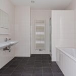 De badkamer is modern uitgevoerd, volledig betegeld en zowel voorzien van een ligbad met thermostaatkraan als een douchecabine met thermostaatkraan alsmede twee wastafels met spiegels en designradiator.