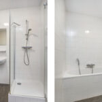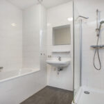 De badkamer is modern uitgevoerd, volledig betegeld en zowel voorzien van een ligbad met thermostaatkraan als een douchecabine met thermostaatkraan alsmede twee wastafels met spiegels, wandkast en raampartij.