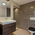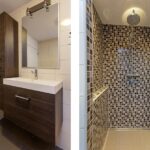 De ruime en modern afgewerkte badkamer is inpandig vergroot, geheel betegeld en voorzien van een grote inloopdouche met glazen deur en thermostaatkraan, badmeubel met wastafel, wandkast en hangend closet.