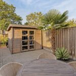 De royaal bemeten en moderne achtertuin heeft een diepte van circa 13 meter. Door de vrije ligging en slimme indeling is de tuin een oase van rust, die onder meer is voorzien van een ruim terras met sierbestrating, grote houten schuur en een prachtig en groot vlonderterras direct aan de singel.