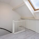 Overloop met laminaatvloer, glad gestucte wanden, vaste bergkast en trapopgang.