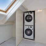 Via een vaste trap is de voorzolder bereikbaar, die is voorzien van een laminaatvloer, glad gestucte wanden -en plafond, bergruimte achter de knieschotten en ingebouwde kastenwand met CV-opstelling, wasmachine- en drogeraansluiting en mechanische ventilatie-unit.