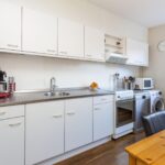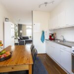 De grote keuken is aan de voorzijde van de woning gesitueerd en voorzien van een recht keukenblok met losse apparatuur en wasmachine-aansluiting.