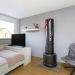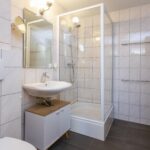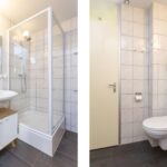 De nette badkamer is geheel betegeld en voorzien van een douchecabine met thermostaatkraan, wastafel, hangend closet en designradiator.