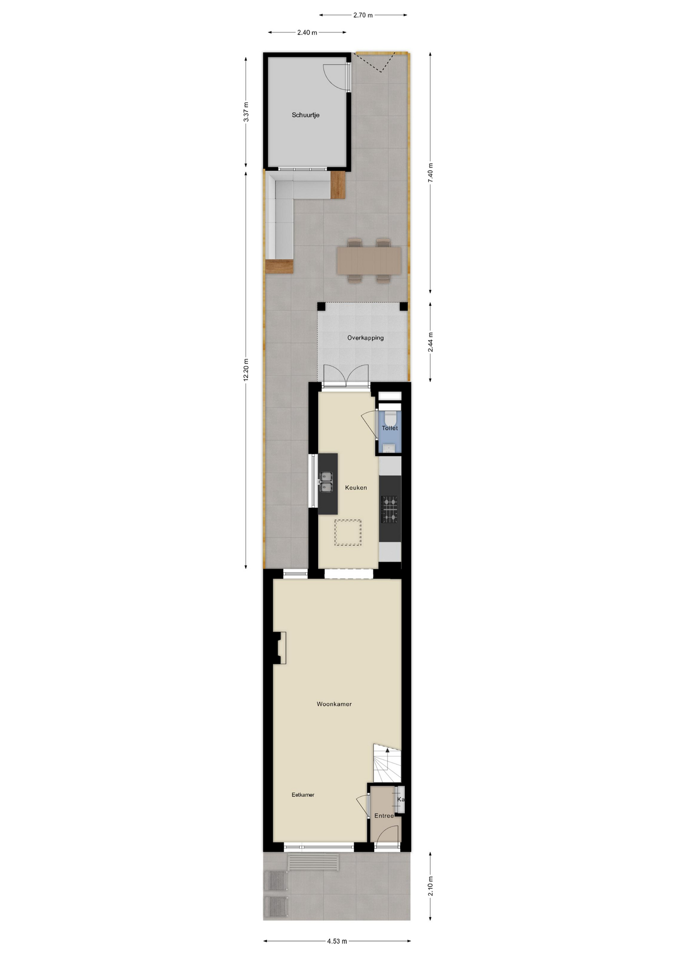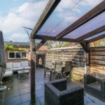 De grote en vrij gelegen achtertuin heeft een lengte van circa 16 meter en biedt volop privacy. De tuin is voorzien van een royaal terras met moderne bestrating en beschikt daarnaast over een overkapping, grote stenen schuur, stalen schuur en achterom.