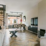 De sfeervolle living is zeer ruim van afmeting en heerlijk licht en voorzien van een mooie visgraat PVC-vloer, glad gestucte wanden -en plafond, strakke open haard, trapopgang.