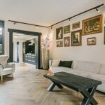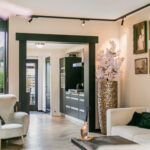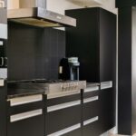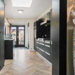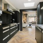 De living loopt via een stijlvolle toog ongemerkt over in de heerlijk ruime keuken. Hier tref je een modern en groot keukenblok aan twee zijden met Belgisch hardstenen blad en diverse inbouwapparatuur, te weten; koel-/vriescombinatie, 5-pits gaskookplaat met wokbrander, heteluchtoven, RVS-afzuigkap en vaatwasser. Daarnaast is er prettig veel werk- en kastruimte, een fraai, vast wijnrek en een separate kast met wasmachine- en drogeraansluiting.