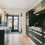 Door de lichtkoepel en de openslaande tuindeuren heeft ook de keuken aangenaam veel lichtinval.