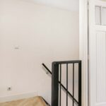 Overloop met vinylvloer, gestucte wanden, paneeldeuren, vaste kast en luik met vlizotrap naar de bergvliering.