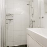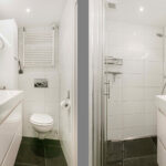 De badkamer is modern uitgevoerd en geheel betegeld en voorzien van een inloopdouche met thermostaatkraan en drain, breed badmeubel met wastafel, verlichte én verwarmde spiegel, hangend closet, designradiator, elektrische vloerverwarming, mechanische ventilatie en glad gestuct plafond met inbouwverlichting.