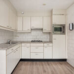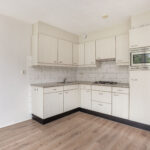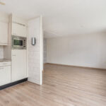 De lichte en brede woonkamer met keukenblok geeft toegang tot een ruim terras van circa 14 m2. Op de begane grond van het complex is nog een separate fietsenberging aanwezig.