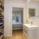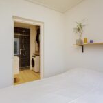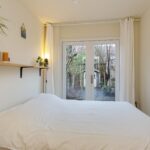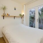 Aan de achterzijde (tevens tuinzijde) is de slaapkamer gesitueerd. De slaapkamer biedt middels openslaande deuren ook toegang tot de tuin. Via de slaapkamer is de moderne badkamer bereikbaar. In de badkamer is er voldoende ruimte voor enkele kledingkasten, een wasmachine- en drogeraansluiting, een wastafelmeubel en een zeer ruime inloopdouche.