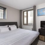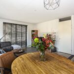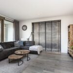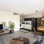 De ruime woonkamer is voorzien van een rijke lichtinval, door de raampartij en schuifpui richting het balkon. Er is voldoende ruimte voor een comfortabele zit- en eethoek in de sfeervolle woonkamer. De open keuken is ingericht met een licht hoekmeubel, een 4-pits inductiekookplaat, een afzuigkap, een oven en een vaatwasser. Het donkere werkblad en bovenkastjes zorgen voor een mooi contrast, evenals de tegels op de vloer.