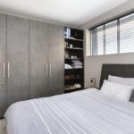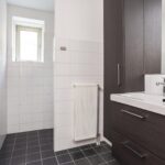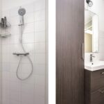 De slaapkamer is gelegen aan de voorzijde en is voorzien van een fijne lichtinval, door de dubbele raampartij en nette wanden. De badkamer is volledig betegeld en uitgerust met een inloopdouche, wastafelmeubel, spiegel, hangkast en een radiator.
