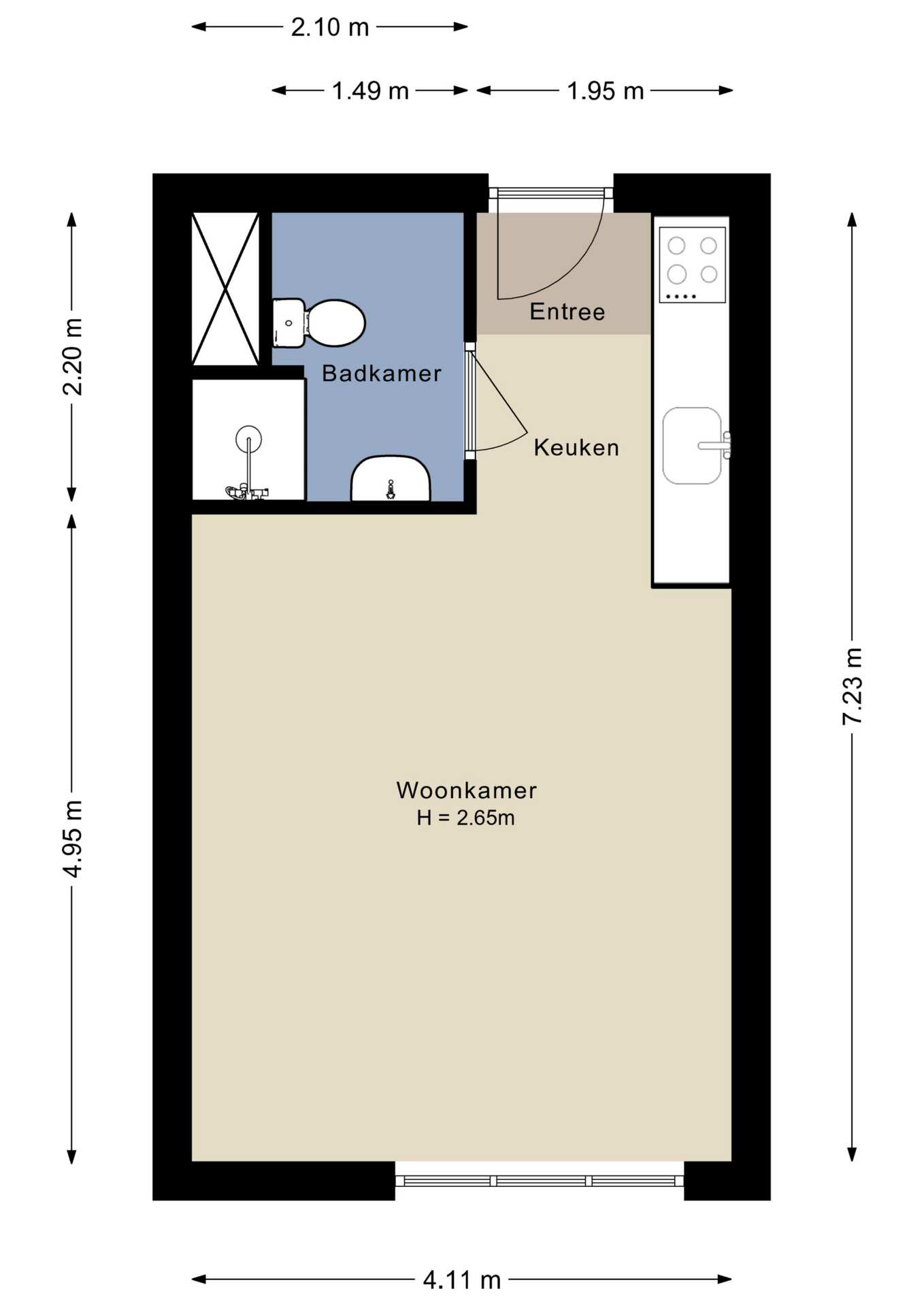 Als je deze studio binnenkomt, vind je aan de ene kant de keurige, open keuken, waar je elektrisch kunt koken (er is geen gasaansluiting). Aan de andere zijde heb je de badkamer met douche, toilet en wastafel. Hier kun je bovendien de wasmachine aansluiten. Aansluitend aan de open keuken heb je de woon/slaapkamer (samen circa 25 vierkante meter) met grote raampartijen die zorgen voor een prettige lichtinval.