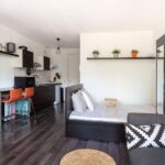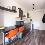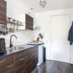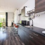 Je komt het appartement binnen in een brede hal waarin gelijk de keuken is aangelegd. Dankzij de doorgetrokken antracietkleurige laminaatvloer, wordt er een optimaal ruimtelijk effect gecreëerd in deze studio. De keuken heeft een riant formaat voor dit appartement. Aan kast- en werkruimte heb je hier geen gebrek! Je beschikt over een afzuigkap en verder is er ruimte voor diverse op- en onderbouwapparaten. Indien gewenst is de koelkast over te nemen van de huidige eigenaar.
