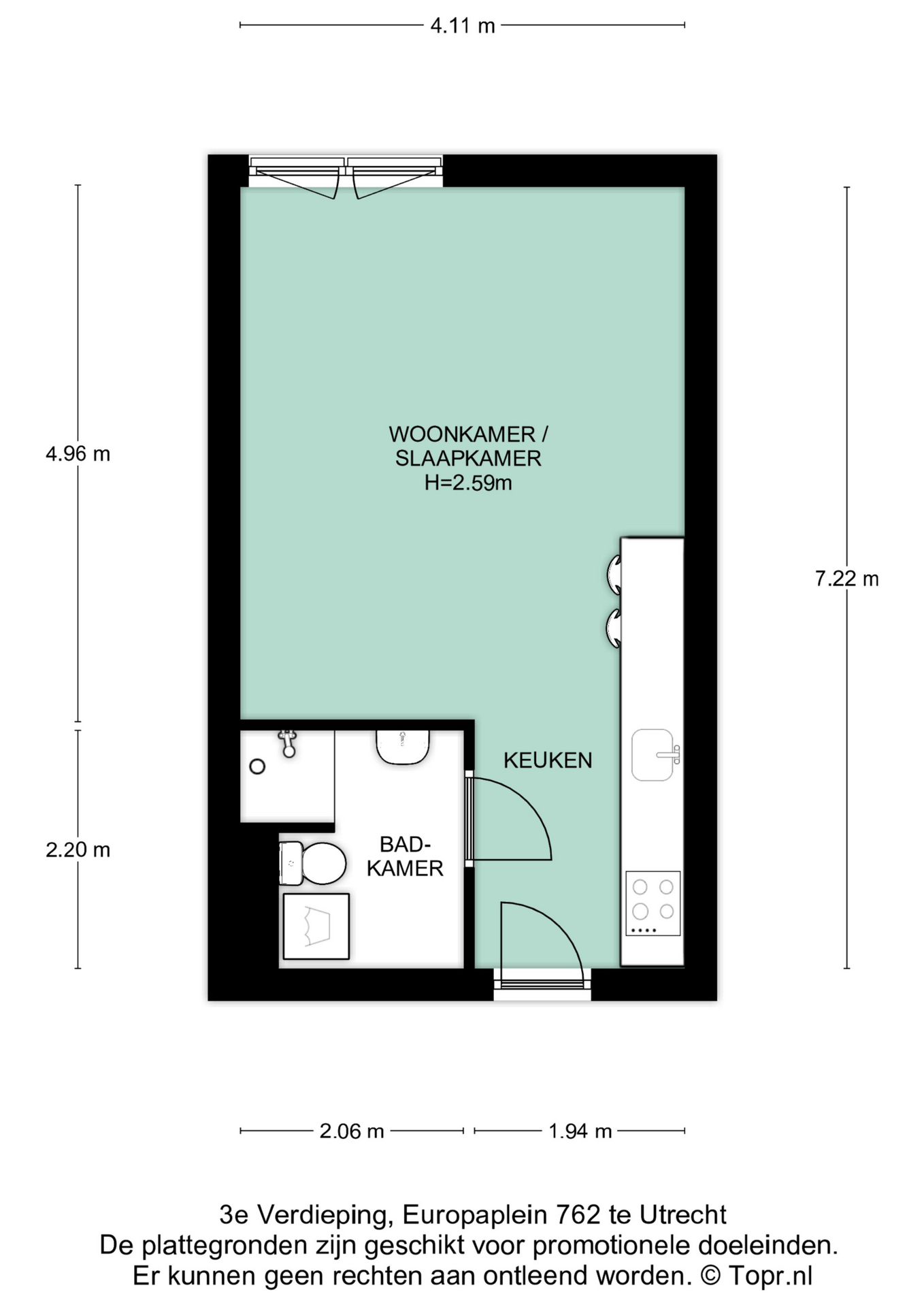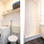 Vervolgens loop je langs het eetbarretje door naar de woon/slaapkamer. Een heerlijk lichte ruimte die dankzij de praktische indeling voldoende creatieve mogelijkheden biedt voor een zithoek, werkplek en slaapgedeelte, zonder dat deze elkaar in de weg staan. Het grote venster met Frans balkon zorgt voor een aangename lichtinval en bovendien voor een lekker uitzicht over de stad. Tot slot is er nog een separate badkamer, voorzien van douchecabine, toilet, wastafel en aansluiting voor de wasmachine en droger. De woning is in nette staat en recent volledig geschilderd.