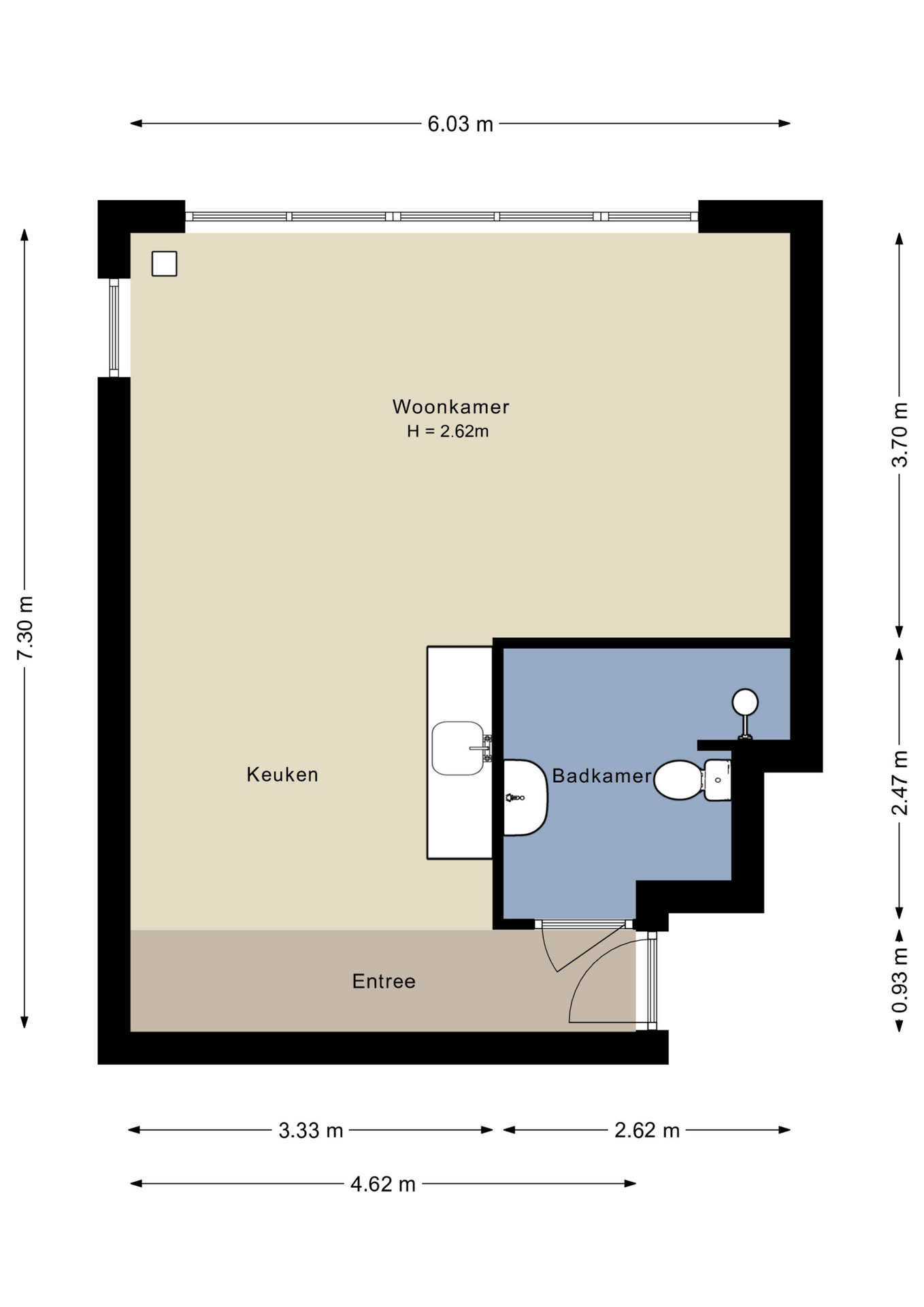 Je komt het appartement binnen in de entree die doorloopt in de open keuken. Aansluitend kom je in de woonkamer/slaapkamer, met grote raampartijen wat zorgt voor prachtig lichtinval. Tot slot is er nog een separate badkamer, voorzien van douche, toilet, wastafel en aansluiting voor de wasmachine.