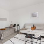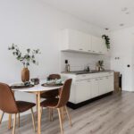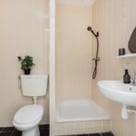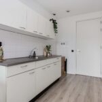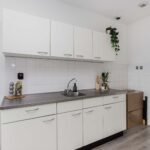 Als je deze studio binnenkomt, vind je aan de ene kant de keurige, open keuken, waar je elektrisch kunt koken (er is geen gasaansluiting). Aan de andere zijde heb je de badkamer met douche, toilet en wastafel. Hier kun je bovendien de wasmachine aansluiten. Aansluitend aan de open keuken heb je de woon/slaapkamer (samen circa 25 vierkante meter) met grote raampartijen die zorgen voor een prettige lichtinval.