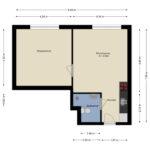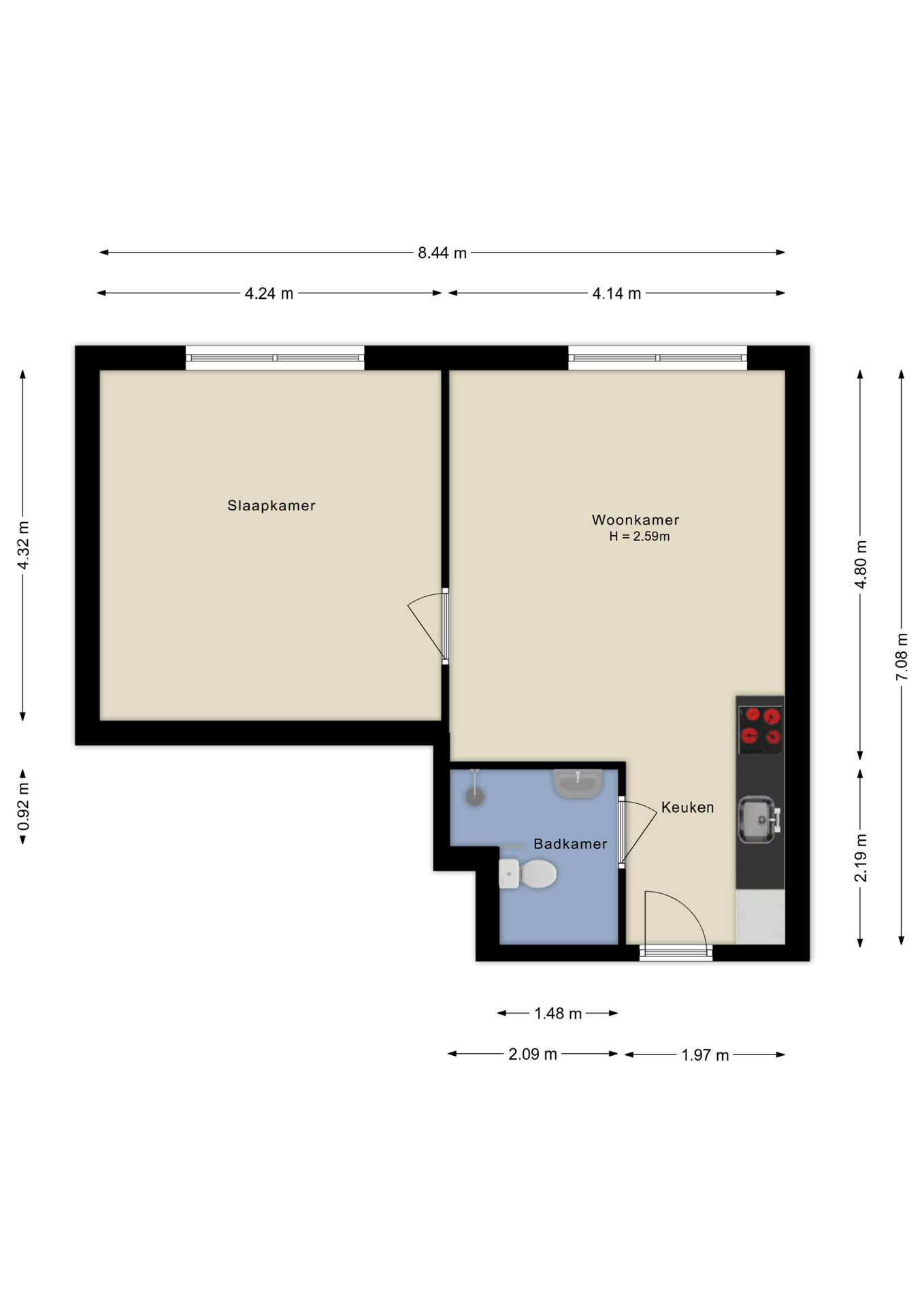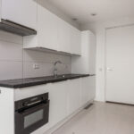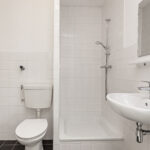 Entree, keurige keuken in lichte kleurstelling v.v. inductiekookplaat, afzuigkap, koelkast, vriezer, combi-magnetron en vaatwasser. Aan de andere zijde heb je de badkamer met douche, toilet en wastafelmeubel. Hier kun je bovendien de wasmachine aansluiten. Aansluitend aan de open keuken heb je de woonkamer met Frans balkon. Vanuit de woonkamer kom je in de ruime slaapkamer met eveneens een Frans balkon.