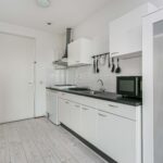 Als je deze studio binnenkomt, vind je aan de ene kant de keurige, open keuken, waar je elektrisch kunt koken (er is geen gasaansluiting). Aan de andere zijde heb je de badkamer met douche, toilet en wastafel. Hier kun je bovendien de wasmachine aansluiten. Aansluitend aan de open keuken heb je de woon/slaapkamer (samen circa 25 vierkante meter) met grote raampartijen die zorgen voor een prettige lichtinval.