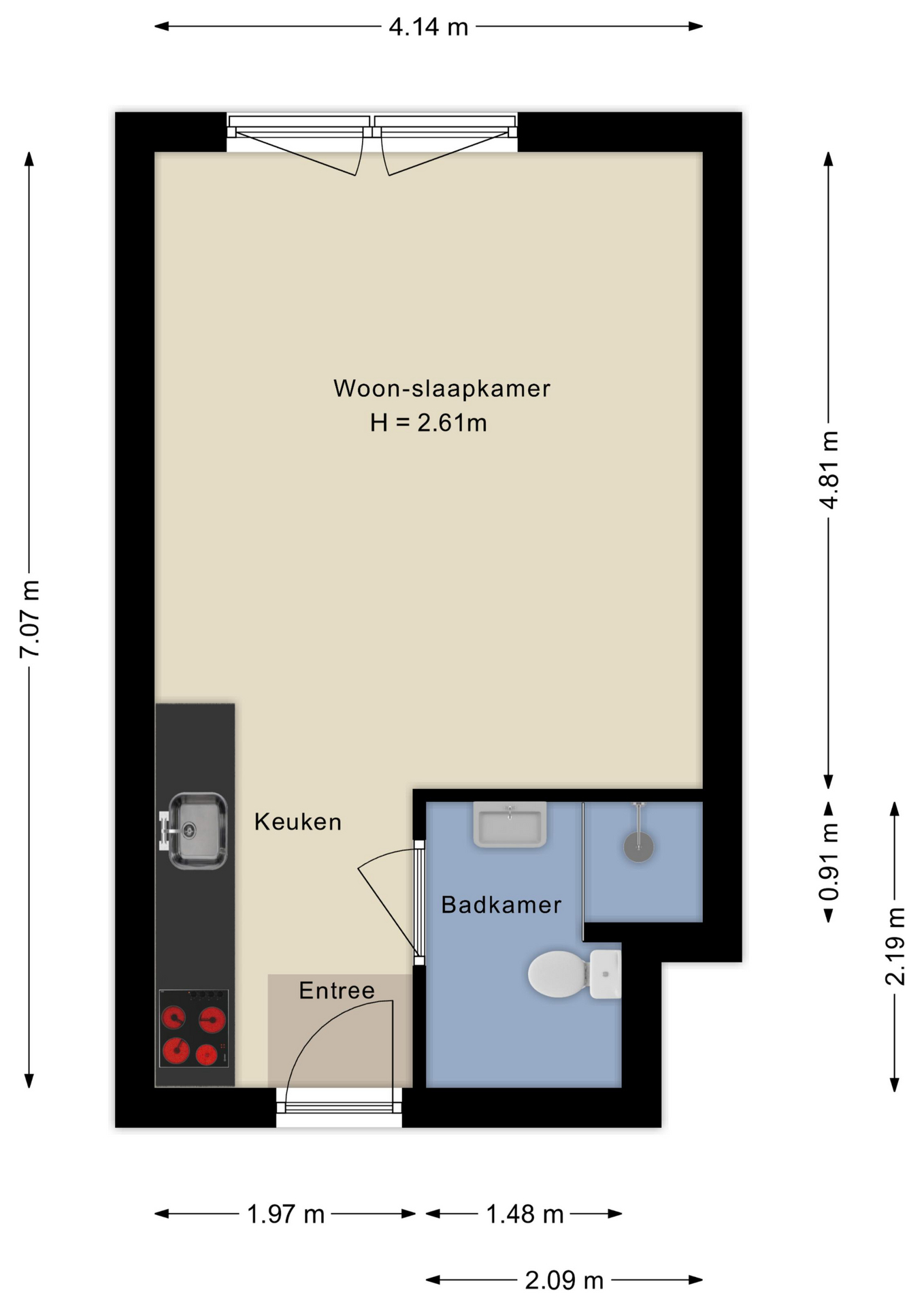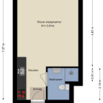 Bij binnenkomst tref je aan de ene zijde de praktische open keuken aan, voorzien van elektrische kookmogelijkheid (geen gasaansluiting). Aan de andere kant ligt de badkamer, voorzien van douche, toilet, wastafel en aansluiting voor een wasmachine. De open keuken loopt over in de lichte woon-/slaapkamer van circa 20 m² met Frans balkon op het zuiden.
