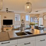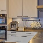- Keuken met inbouwapparatuur: oven, magnetron, inductiekookplaat, afwasmachine, natuurstenen aanrechtblad. Losse koel-vriescombinatie.