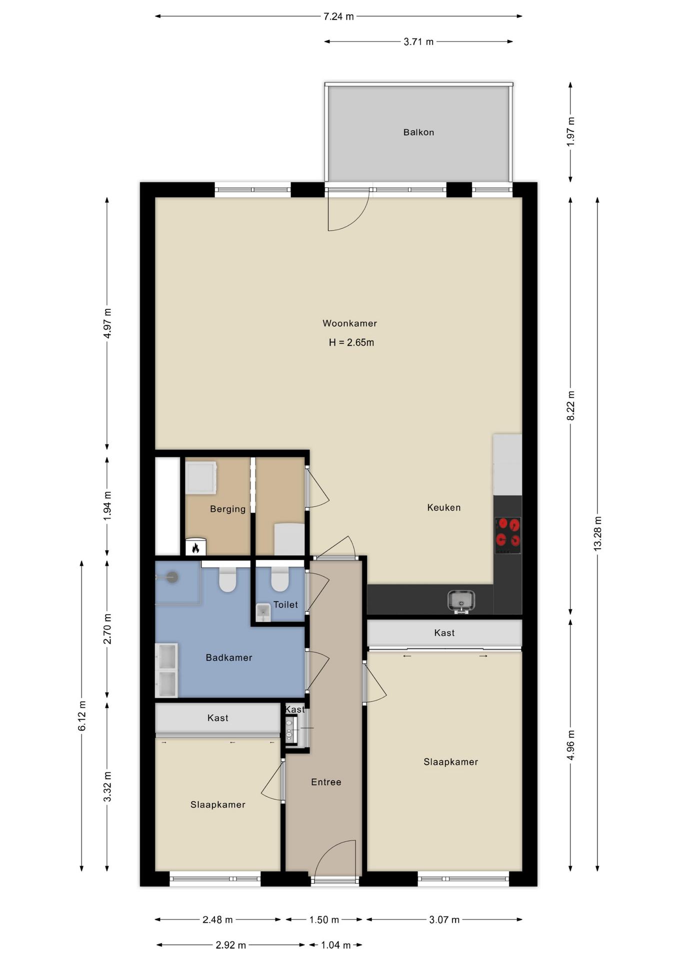 Je komt binnen in een ruime hal met toegang tot vrijwel alle vertrekken. Hier bevinden zich de meterkast, de garderobe en het moderne, separate toilet met fontein. De vloer in de hal loopt naadloos door in de rest van het appartement en bestaat uit een kwalitatieve PVC vloer.