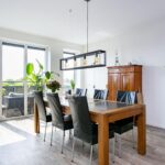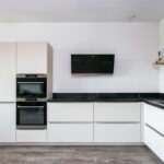 De open keuken bevindt zich in een hoekopstelling en is uitgevoerd in een modern design met een zwart composieten werkblad. De keuken beschikt over alle gewenste inbouwapparatuur: inductiekookplaat, afzuigkap, elektrische oven, combi-magnetron, koelkast met nulgradenlade en vaatwasser. Deze ruimte is ideaal voor kookliefhebbers die houden van comfort én stijl!