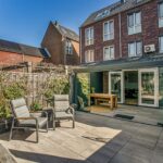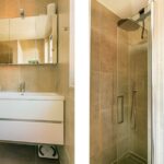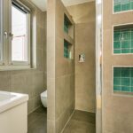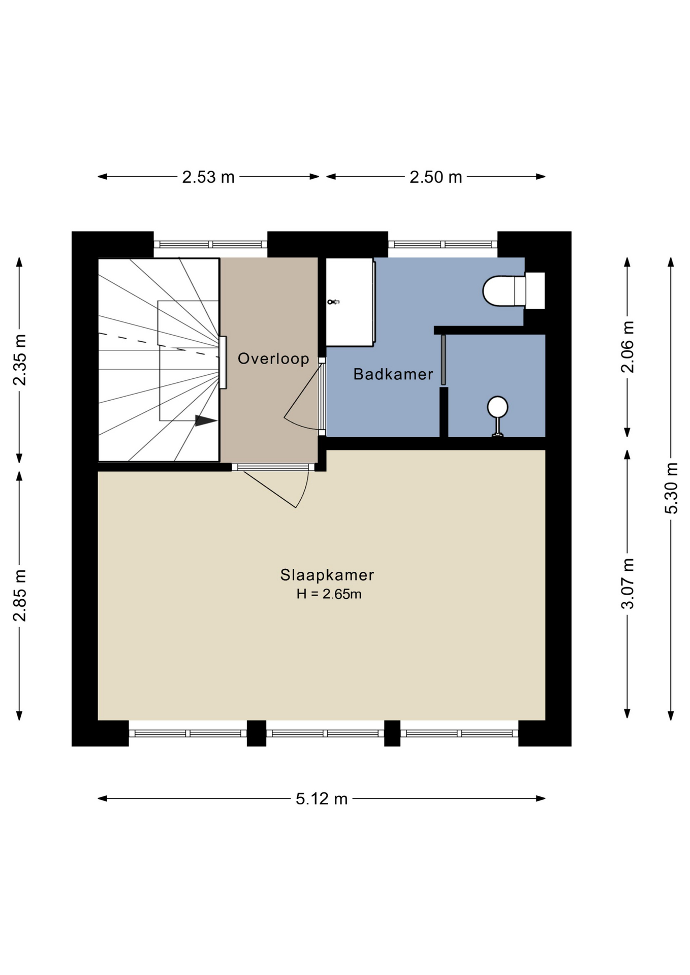 Via de afgesloten trapopgang kom je op de eerste verdieping waar een eiken houten vloer ligt. Via de overloop bereik je een ruime slaapkamer over de volle breedte van de woning en een moderne badkamer voorzien van wastafelmeubel, zwevend toilet en regendouche.
