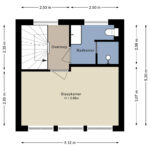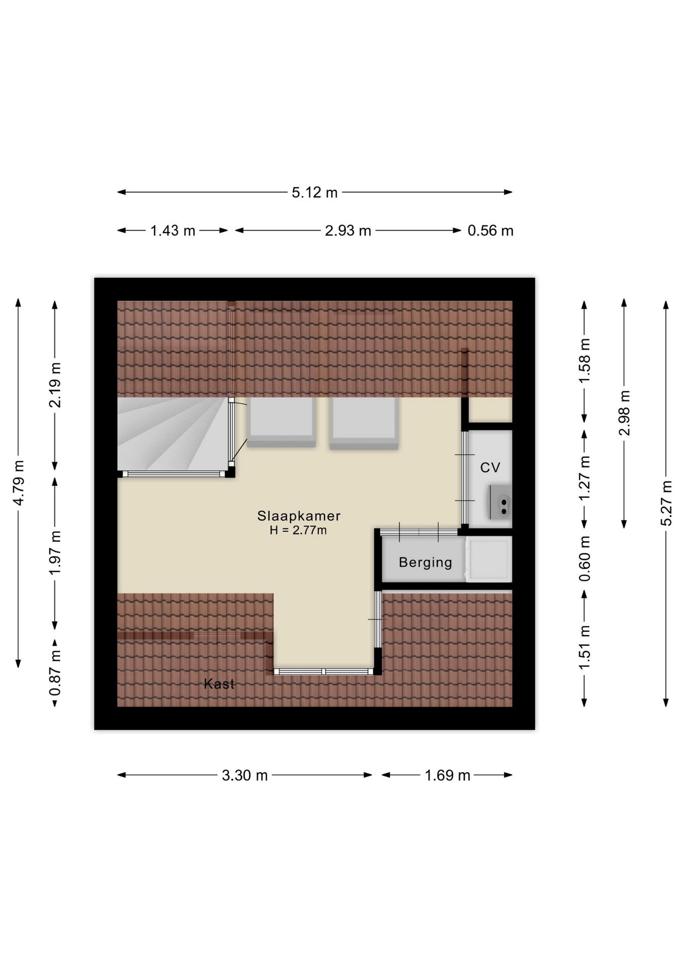 Via een open trap kom je op de derde etage. Deze ruime en lichte kamer is door een deur afgesloten van de trap. Deze kamer is voorzien van een dakkapel aan de voorzijde en aan de achterzijde van Velux dakterrasvensters. Hier ligt eveneens een eiken houten vloer. Op deze etage bevinden zich een aparte ruimte met de Cv-ketel, ruime opbergruimte voor bijvoorbeeld koffers, skispullen e.d. en een aparte ruimte met wasmachine en drogeraansluitingen.