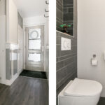 Eenmaal de auto op eigen terrein geparkeerd te hebben kom je bij de entree van de woning. De hal is voorzien van een PVC-vloer (vloerverwarming), moderne lambrisering en een luxe toiletruimte met hangend closet en fonteintje.