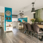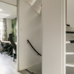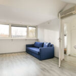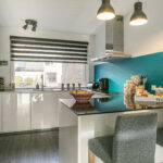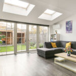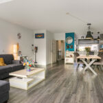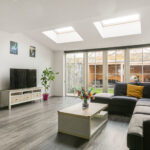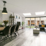 De woonkamer is aan de achterzijde circa 3 meter uitgebouwd en meet samen met de open keuken maar liefst ruim 50 m². De royale glazen achterpui met openslaande deuren en twee Velux-dakramen zorgt voor een overvloed aan licht en een prachtig zicht op de tuin. De afwerking is strak, met een PVC-vloer, glad gestucte wanden en praktische trapkast.