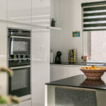 De moderne U-vormige keuken aan de voorzijde is uitgerust met een composiet aanrechtblad, inductiekookplaat, oven, combimagnetron, vaatwasser, koelkast, vriezer, RVS-afzuigkap en veel kastruimte.