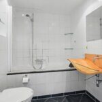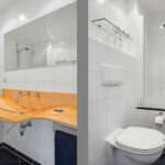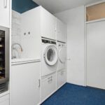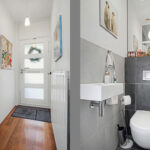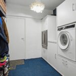In de bijkeuken bevinden zich de witgoedaansluitingen, keukenblokje met kraan en een wijnklimaatkast. De moderne toiletruimte is volledig betegeld en voorzien van een hangend toilet en fonteintje.