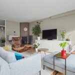 De ruime en lichte woonkamer bevindt zich aan de achterzijde van de woning. Via de grote schuifpui kijk je prachtig uit op de tuin. De woonkamer is voorzien van een parketvloer met convectorradiator en een gezellige sfeerhaard, welke te gebruiken is als open haard.