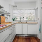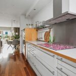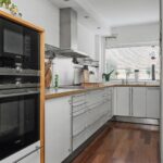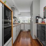 De open keuken is aan de voorzijde van de woning gesitueerd. Door de plaatsing in een L-opstelling en een separate kastenwand is veel werk- en kastruimte ontstaan. De keuken is voorzien van diverse inbouwapparatuur te weten; inductie kookplaat, RVS-afzuigkap, magnetron, oven, koelkast, vriezer en vaatwasser. Handig zijn de anderhalve spoelbak en direct warm water door middel van de close-in boiler. Fijn is het grote raam met zicht op de voortuin.