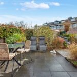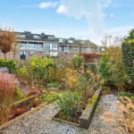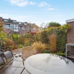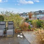 De grote achtertuin van circa 64 m² ligt op het zonnige zuidoosten en is prachtig aangelegd met grote vierkante grijze tegels, sierborders met beplanting en mooie schuttingen. Er is een buitenkraan, zonwering over de volledige breedte van de woning en een praktische kleine berging aanwezig. In deze tuin kan je heerlijk genieten van lange zomeravonden.