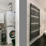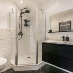 De ruime, modern afgewerkte, badkamer is volledig betegeld en voorzien van een douchecabine met regen- en handdouche en thermostaatkraan, breed wastafelmeubel met bijpassende spiegelkast, hangend toilet, designradiator en glad gestuct plafond met inbouwspots.