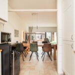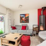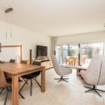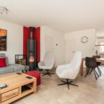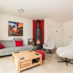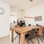 De woonkamer is ruim van afmeting en heerlijk licht door de woningbrede glazen achterpui met schuifdeur naar de aangebouwde tuinkamer. De living heeft een afmeting van circa 30m2, is stijlvol afgewerkt met een tegelvloer met vloerverwarming en gestucte wanden en beschikt daarnaast over een houtkachel en praktische trapkast.
