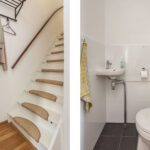 Entree naar de hal met Amerikaans eikenhouten vloerdelen en spuitwerkwanden, gemoderniseerde toiletruimte met closet en fonteintje, meterkast, trapopgang en deur naar de woonkamer.