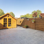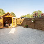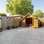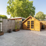 De grote en vrij gelegen achtertuin is fraai aangelegd met moderne sierbestrating en enkele houten bakken met vaste beplanting.