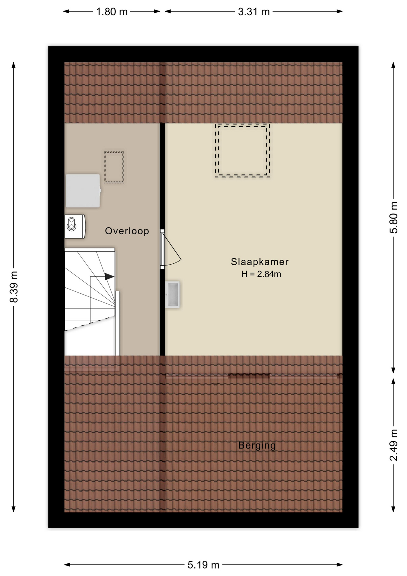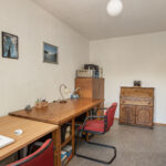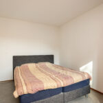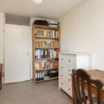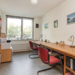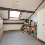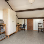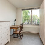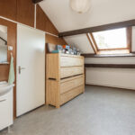 De volwaardige vierde slaapkamer is zeer ruim van afmeting én heerlijk licht het grote Velux-dakraam. De kamer is keurig afgewerkt met een vinylvloer en structuurverfwanden en beschikt over een wastafelmeubel en veel bergruimte achter de knieschotten.