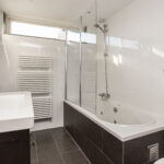De modern afgewerkte badkamer is geheel betegeld en voorzien van een jacuzzi met thermostaatkraan, breed badkamermeubel met wastafel en spiegelkast, designradiator, hangend closet, mechanische ventilatie, kleine raampartij en verlaagd plafond met led-inbouwspots.