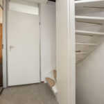 Overloop met vinylvloer, spuitwerkwanden en trapopgang naar de 2e verdieping.