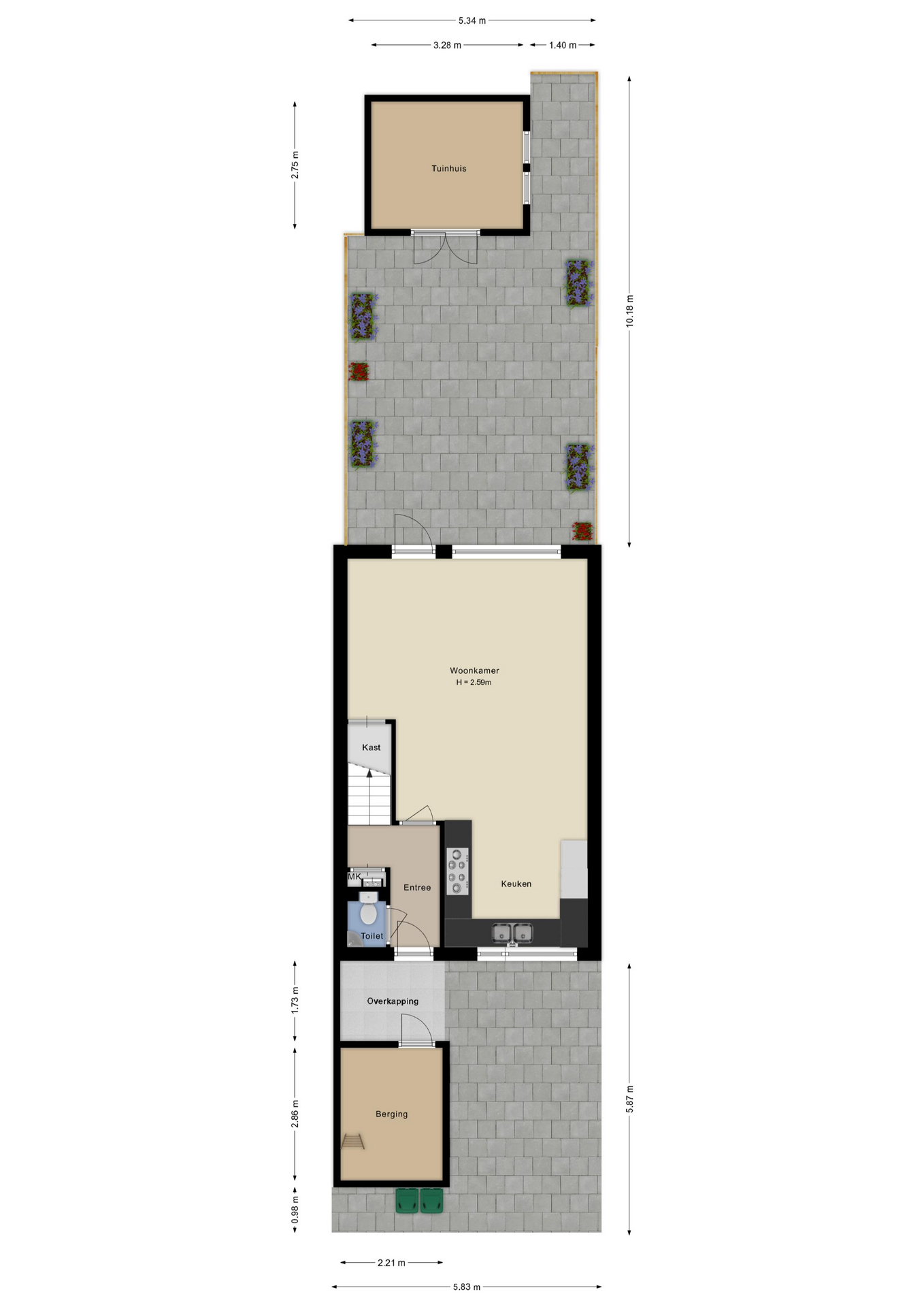 De voortuin biedt parkeerplaats voor één auto en is voorzien van een grote stenen schuur met bergvliering en elektra.