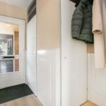 Entree naar de hal met laminaatvloer, spuitwerkwanden en houten lambrisering, gemoderniseerde toiletruimte met closet en fonteintje, meterkast, trapopgang en deur naar de woonkamer.