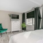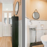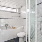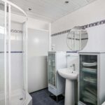 De ruime en gemoderniseerde badkamer is geheel betegeld en voorzien van een jacuzzi, douchecabine met thermostaatkraan, wastafel, twee bergkasten, designradiator, closet, elektrische vloerverwarming, mechanische ventilatie, kleine raampartij en verlaagd plafond met inbouwspots.